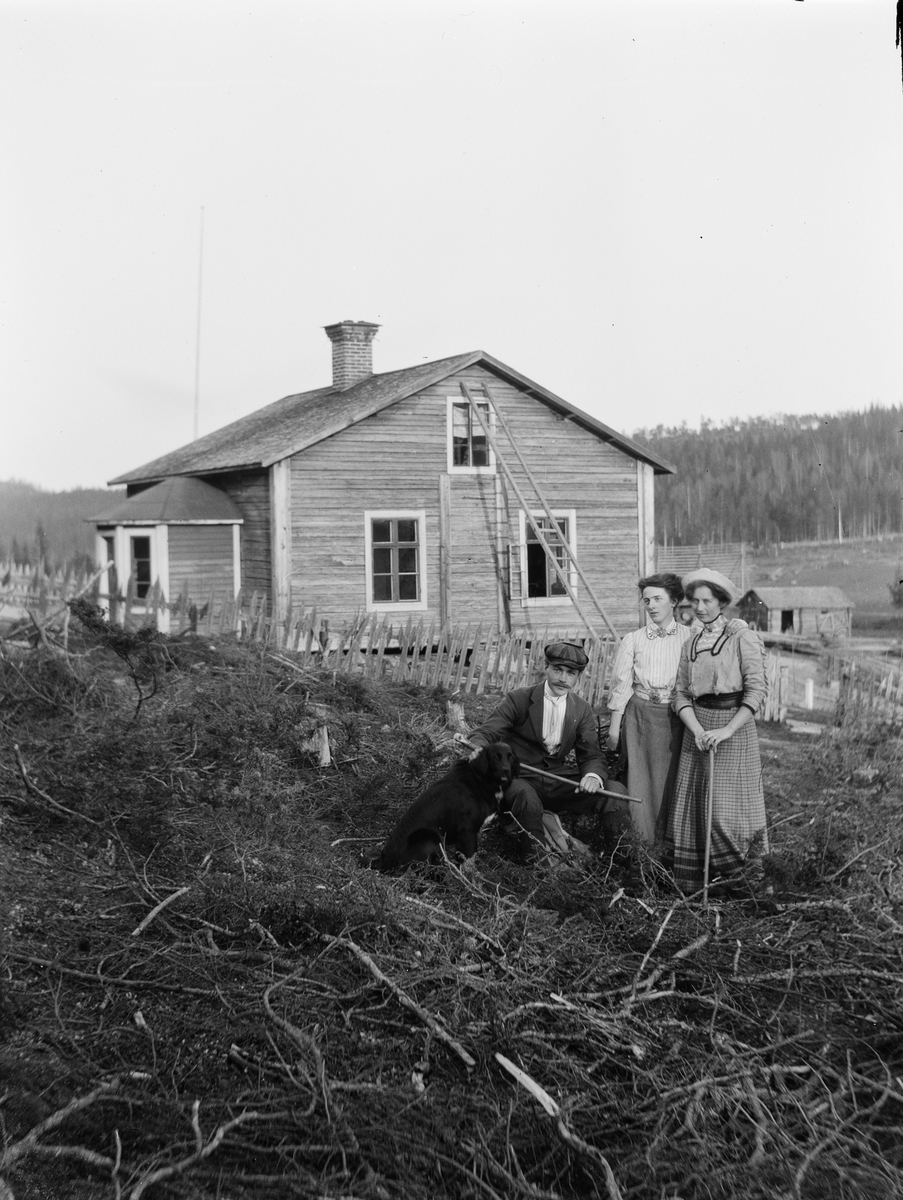 Sannolikt Josef Ärnström med två kvinnor framför ett bostadshus