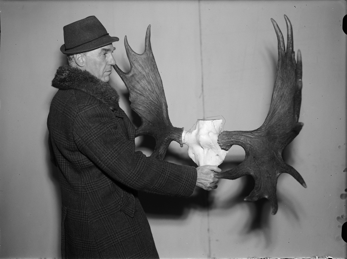 Tandläkare Erik Melchert med älghorn på Uppsala Läns Jaktvårdsförenings jubileumsutställning på Östgöta studentnation