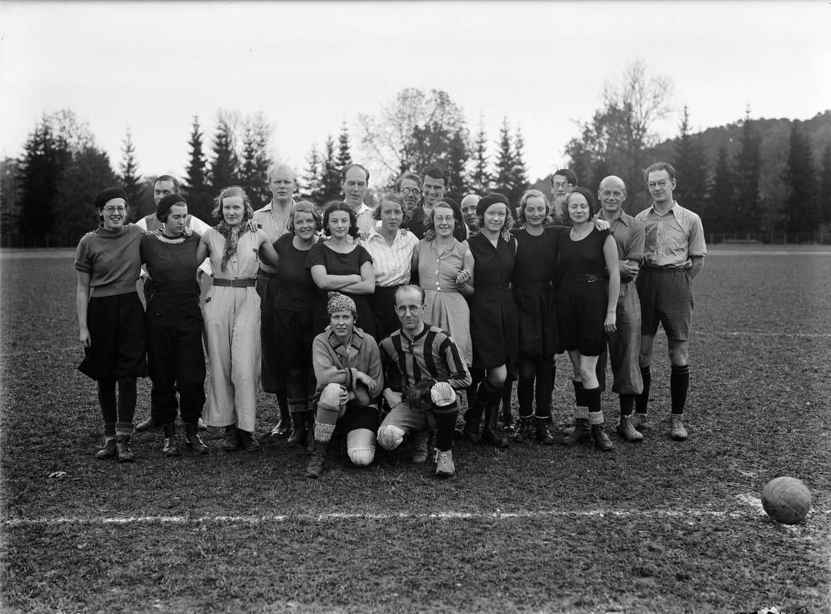 Två fotbollslag vid Västmanlands-Dala studentnation "i systerlig och broderlig sämja innan det stora slaget började", sannolikt på Studenternas Idrottsplats