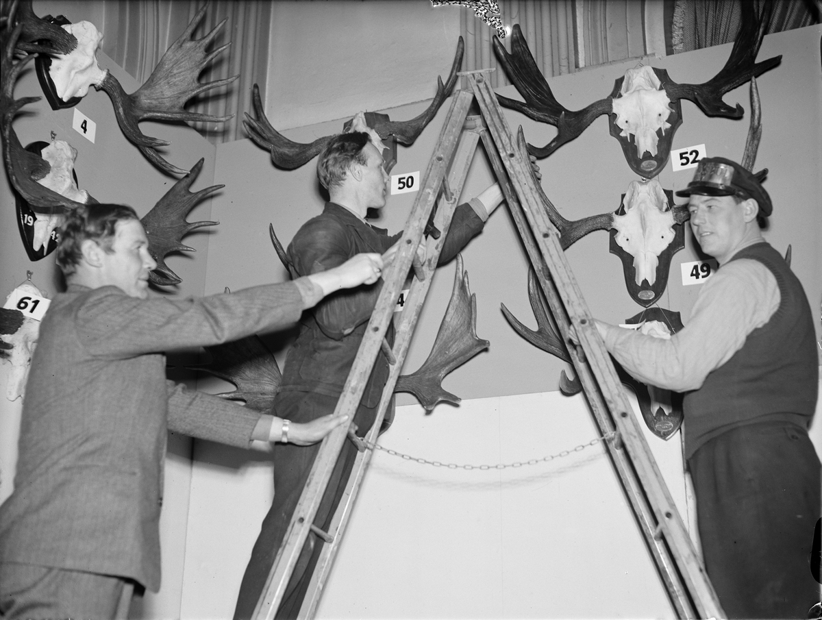Stadsbuden Jansson och Gustafsson hänger upp älghorn med hjälp av godsägaren P J Högfeldt j:r i Uppsala Läns Jaktvårdsförenings jubileumsutställning på Östgöta studentnation