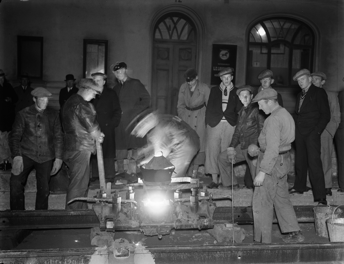 Spårvägsarbeten utanför AB L E Larsson & Co:s skofabrik på Svartbäcksgatan