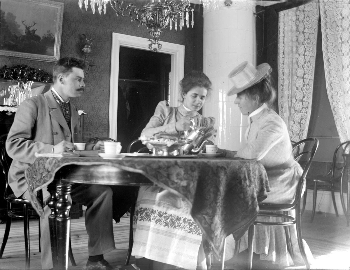 Kvinnor och män vid kaffebord, sannolikt i Uppsala