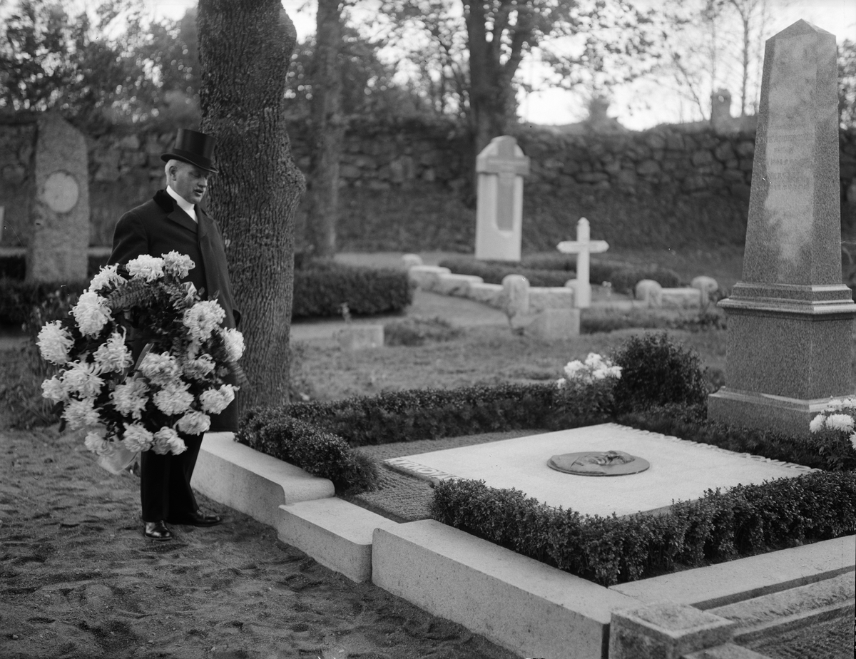 Kyrkoherde Elof Lyttkens lägger församlingens krans på minnesvården över häradsdomare E E Eriksson i Fullerö, Gamla Uppsala kyrkogård