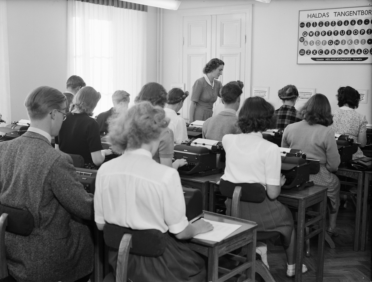 Maskinskrivningskurs vid AB Åtvidabergs Industriers institut. Läraren Wera Carlsson i bakgrunden