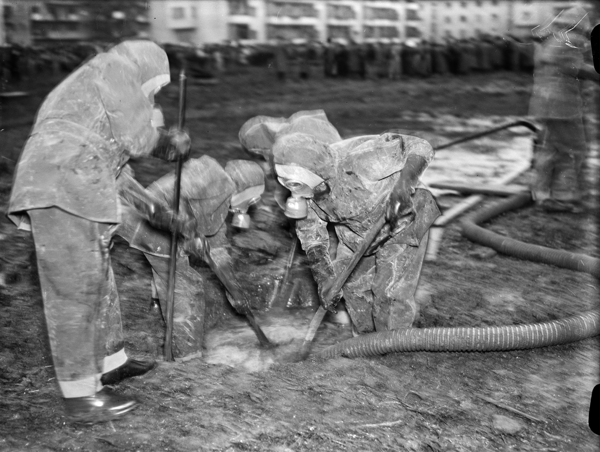 Militärer i skyddskläder och gasmask reparerar en skadad vattenledning, Artillerigärdet