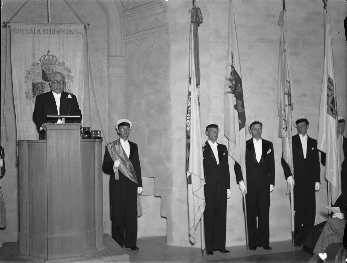 Professor Nils Ahnlund högtidstalar på Uppsala Studentkårs vårfest i Rikssalen, Uppsala slott