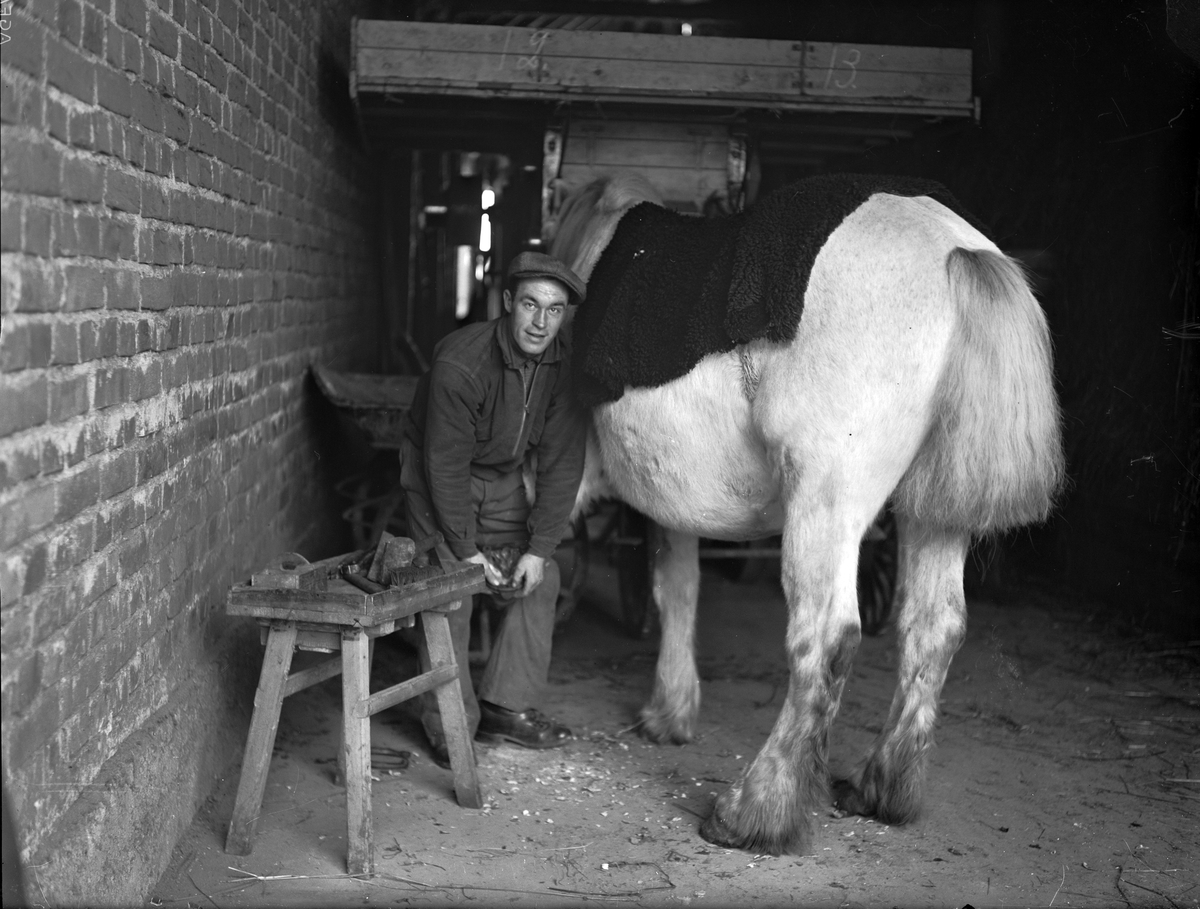 "J.U.F.-tävlan i hovbeslag" i Lytta, Bälinge socken, Uppland januari 1935. Hovslagare med häst
