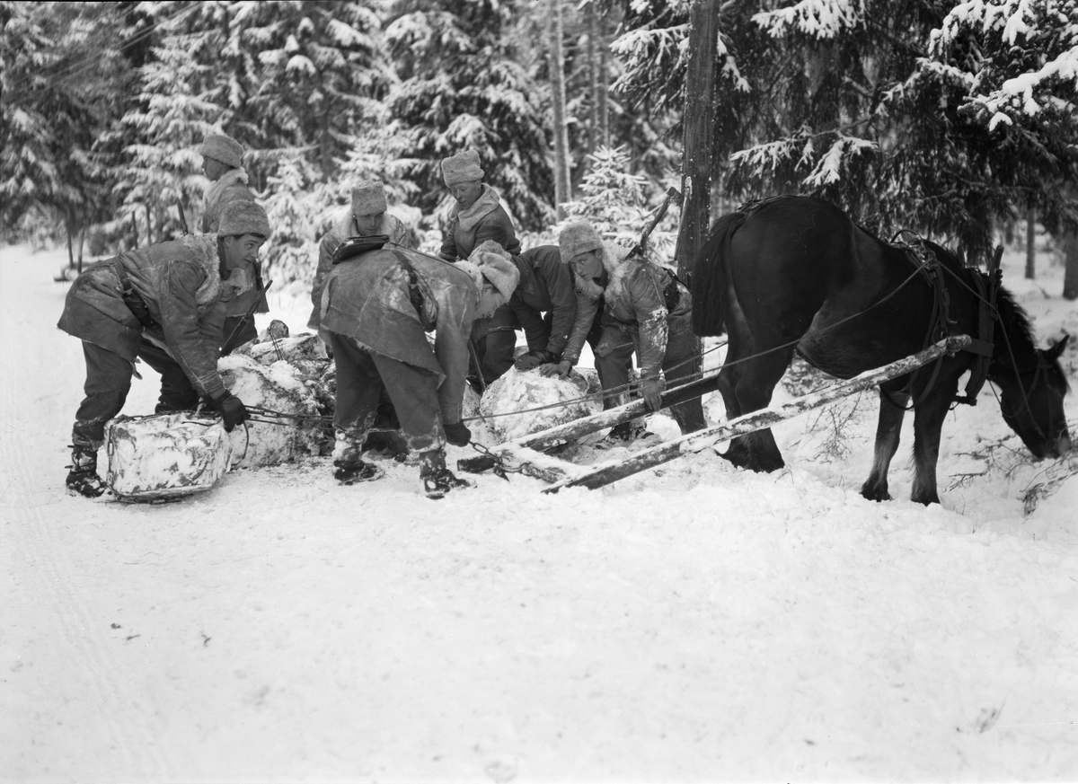"2,500 man på upländsk manöver. Realistisk strid under morgontimmarna i dag i trakten av Järlåsa", Uppland december 1942