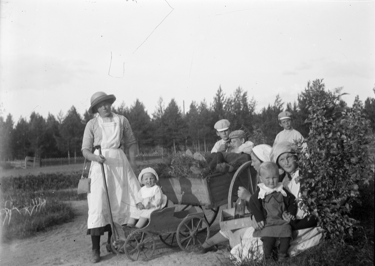 Tre kvinnor med barn, bland annat Alf, Roland och Ingemar Liljefors, ute på gården. Marit Liljefors sitter i en liten kärra, sannolikt Svensgården, Dalarna