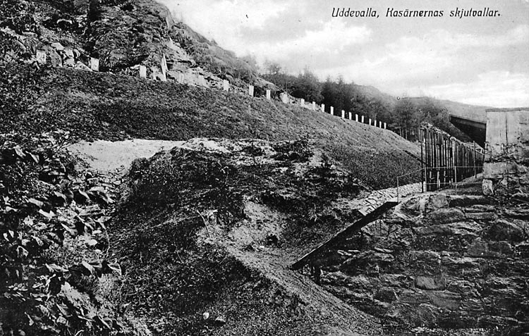 Tryckt text på vykortets framsida: "Uddevalla, Kasärnernas skjutvallar."