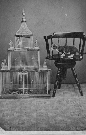 Burfågel och katt hos fotografen