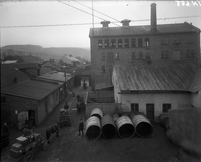 Enligt tidigare noteringar: "Natt och Dags bryggeri, Södra Hamngatan. Interiör från bryggeriets gård med ölutkörare och stora behållare av trä."