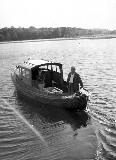 I båten syns Oscar Åkermo och dottern Solveig. Fotografiet är taget år 1959".