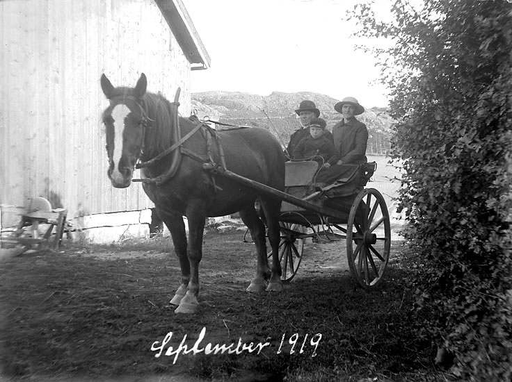 Enligt noteringar: "Hästskjuts. Vid tömmarna Johannes A., dottern Klara och Gösta.