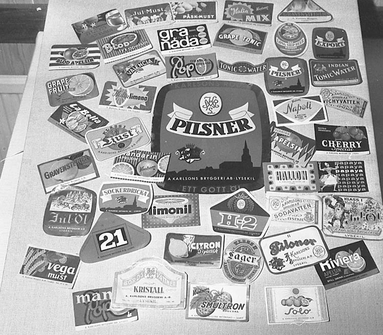 Enligt fotografens notering: "Läskedrycksetiketter från Karlssons bryggeri i Lysekil lades ner 1975".