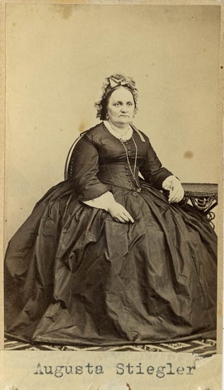 Text på kortets baksida: "Augusta Regina Stiegler, född Sandegren. F. 14/2 1811 d. 4/10 1879. Deltog 19/1 1836 i stiftandet av U-a Sparbank. G. m. Johan Andreas Hiegler, F. 1809 d. 1869".