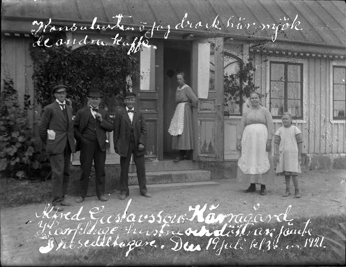 Skrivet på bilden: "1Konsulenten och jag drack här mjök, de andra kaffe. Alfred Gustafsson, Kärragård Harplinge, hustru och döttrar jämte s-resedeltagare.