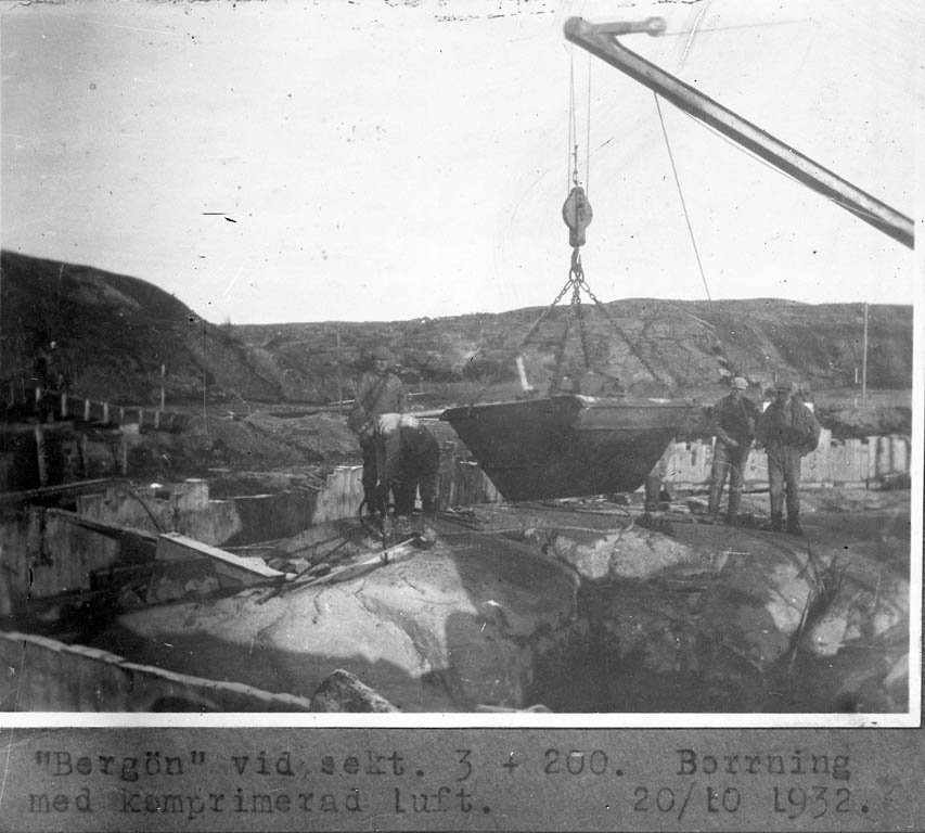 "Bergön" vid sekt. 3. Borrning med komprimerad luft. 20/10 1932. Byggandet av Sotekanalen