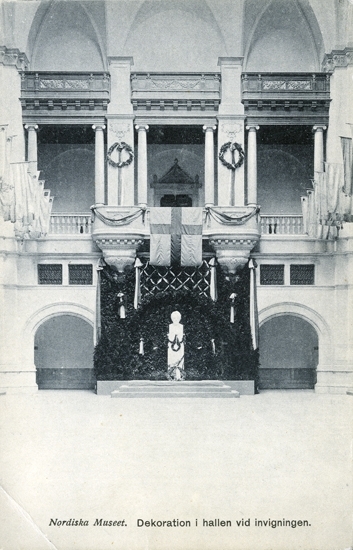 "Nordiska Museet. Dekoration i hallen vid invigningen".