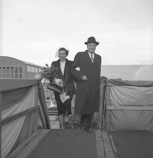 Dop och sjösättning av 122 M/T Glimmingehus. Kvinnan på bilden är fartygets gudmor.