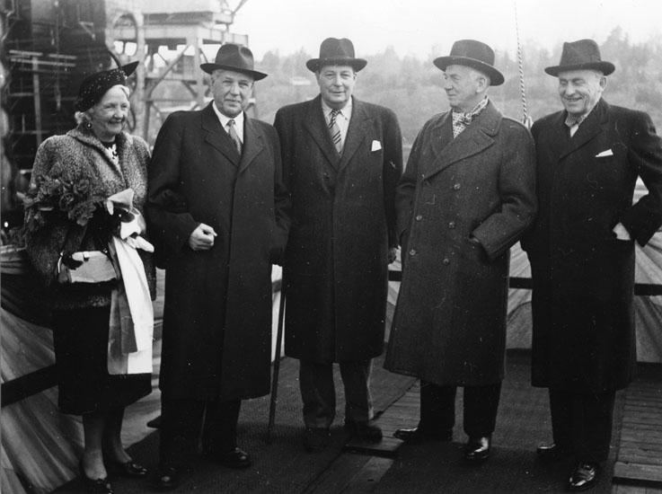 Från dop och sjösättning av fartyg 126 M/T Aslaug Torm. Skrivet på bilden baksida: Gudmor Fru C. Mazanti Andersen, Direktör Olof Sahlin, Skeppsredare Å. Schmiegelord, A. Kampin, C. Mazanti Andersen.