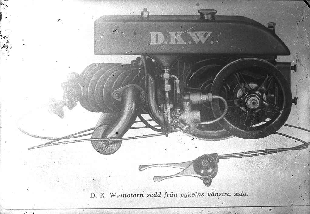 Text på glasplåten: D K W. Motorn sedd från cykelns vänstra sida.
