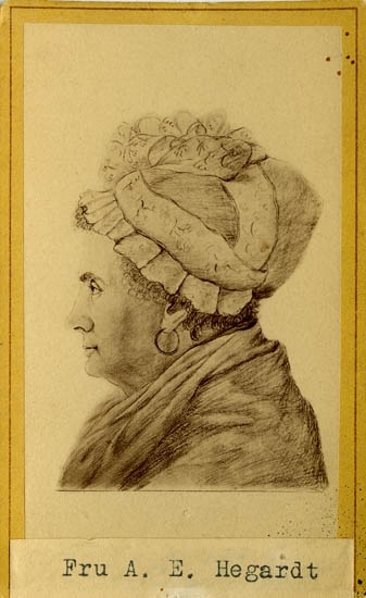 Text på kortets baksida: "Fru Anna Elisabeth Hegardt, f. Bratt. Född 1753 död 1825. Gift 1774 m. Handl. o Skeppsred. i U-a Josias Hegardt, f. 1739 d. 1806 han var gift m. sin brorsvägerska och hans syster Catharina H. var gift Barnhusstiftaren Anders Knape Hansson. Fru A.E. H-ots bror var Rådman Henrik Bernhard Bratt".