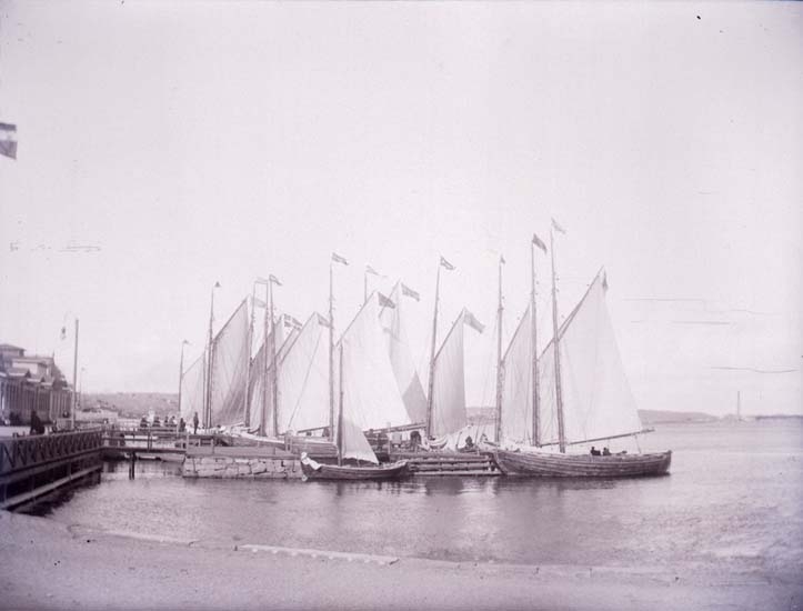 Enligt text som medföljde bilden: "Badgästbåtarne vid Havsb. Lysekil Badhuset 3 sept. 1899 ögonbl. Hugo Hallgren".