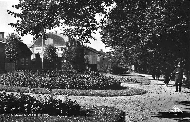Tryckt text på vykortets framsida: "Uddevalla. Under lindarna."