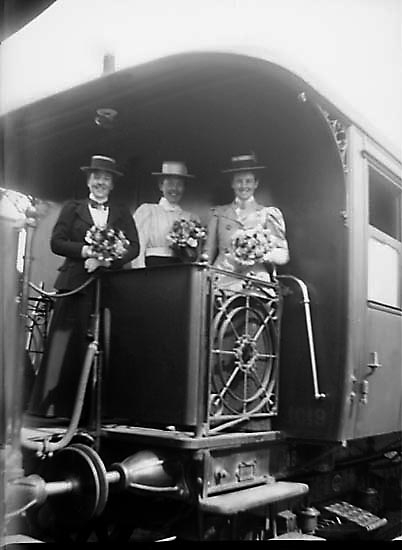 Tre leende kvinnor med blomsterbuketter i händerna står på en plattform bakpå en järnvägsvagn