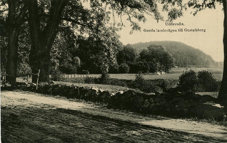 Tryckt text på vykortets framsida: "Uddevalla." "Gamla landsvägen till Gustafsberg."