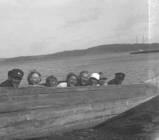 Enl. text i blå bok: "Män och kvinnor tittar över pråmreling."