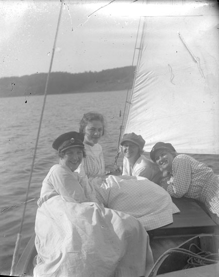 Enl. text i blå bok: "Fyra damer på fördäck på en segelbåt."