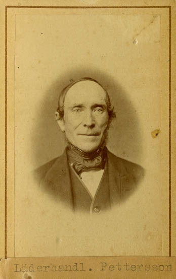Text på kortets baksida: "Läderhandl. Pettersson. Förut hos Joh. Engelkes i Garfveriet, som nedbrann julen 1846. Svåger m. Målare Carlgren. Egde hus vid Helvigsgatan".