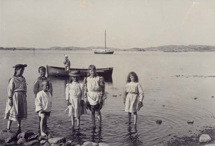 Barn som känner på vattentemperaturen med fötterna. Från Styrsö Villabron i Göteborgs skärgård