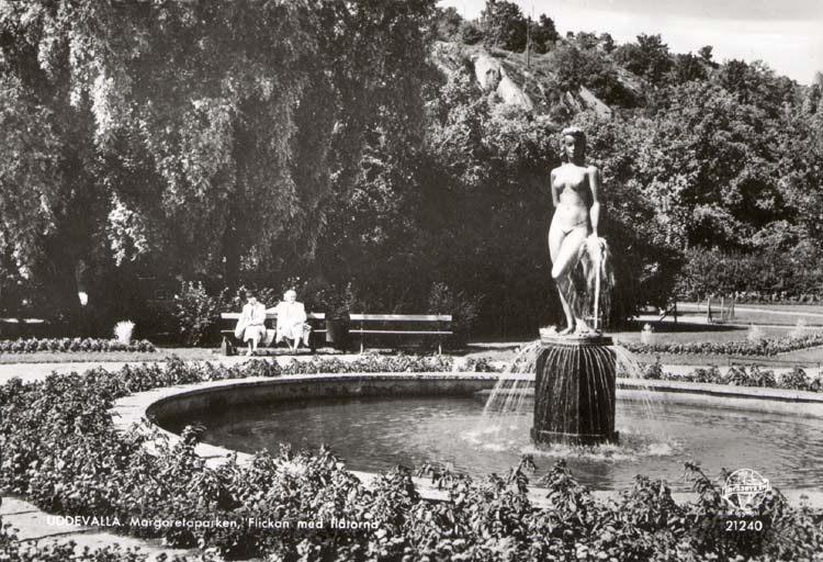 Tryckt text på kortet: "Uddevalla. Margaretaparken, Flickan med flätor."