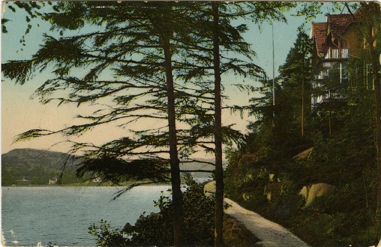 Tryckt text på vykortets baksida: "Gustafsberg strandvägen."