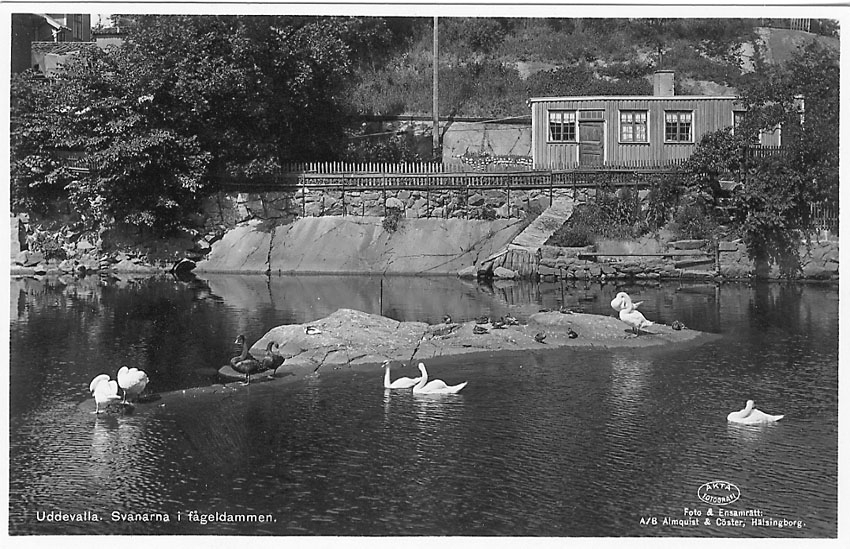 Tryckt text på vykortets framsida: "Uddevalla Svanarna i fågeldammen".