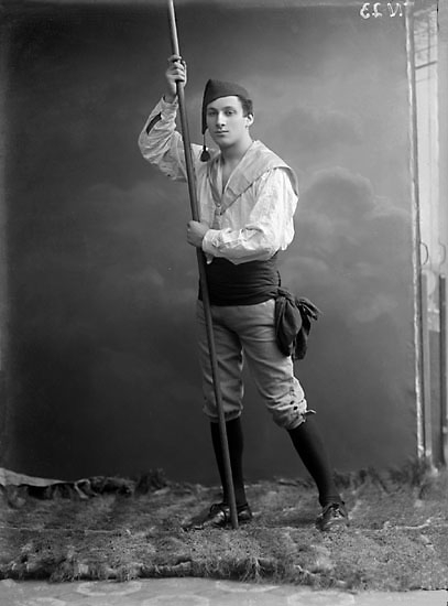 Enligt senare noteringar: "Ateljéfoto av skådespelare i rolldräkt, medverkande i "Pärlfiskarna" i Uddevalla Teater."
