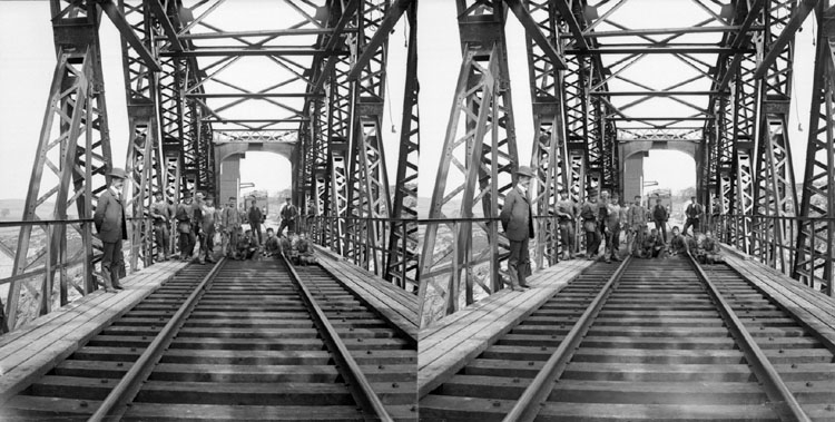 Järnvägsbron över Nordre elf (på bron) 1907, Kungälv. Stereofoto. Stereo karta VI.