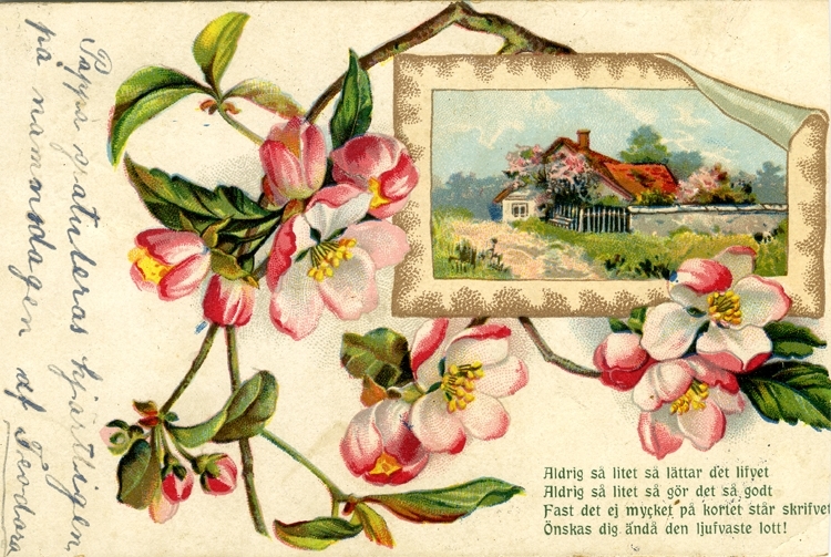 Vykort med tryckt text: Aldrig så litet så lättare det lifvet. Aldrig så litet så gör det så godt.