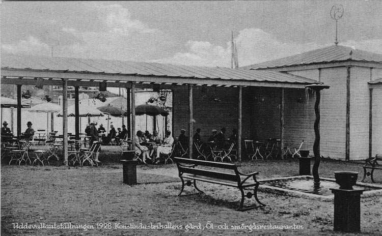Text på kortet: "Uddevallautställningen 1928. Konstindustihallens gård. Öl och Smörgåsrestauranten".