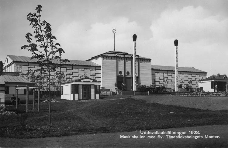 Text på kortet: "Uddevallautställningen 1928. Maskinhallen med Sv. Tändsticksbolagets Monter".