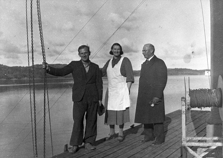 Enligt uppgift: "Fotografi år 1941 från övre bryggan vid stationsbyggnaden. På bilden syns från vänster Oscar Åkermo, Jenny Fagerberg (husmor på stationen) och August Nilsson (trålmästare)".