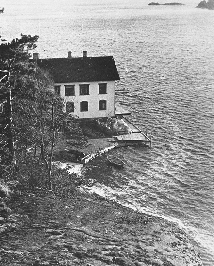 Enligt uppgit: "Fotografiet förmodligen från 1940-talets början. Den nya bryggan är tillbyggd, men slip finns inte (byggdes i början av 1950-talet). Träbron skulle tjäras varje sommar och sjösanden på planen hitom stationsbyggnaden skulle krattas varje lördag".
