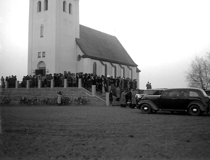Enligt senare noteringar: "Bröllopsgäster och brudpar utanför kapellet.