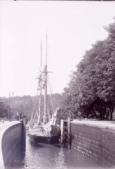 Ett segelfartyg på väg genom slussarna i Trollhättan, juni 1910