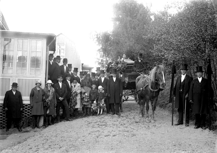 Begravningsfölje med likvagn dragen av en häst utanför ett boningshus
