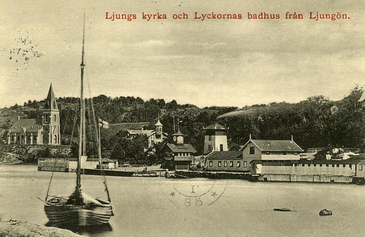 Enligt Bengt Lundins noteringar: "Ljungs kyrka och Lyckornas badhus från Ljungön".