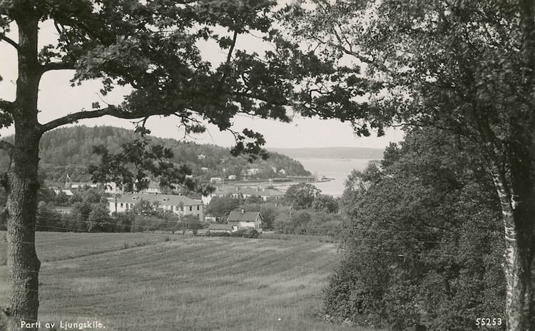 Enligt Bengt Lundins noteringar: "Parti av Ljungskile. Utsikt mot centrum och Valås".